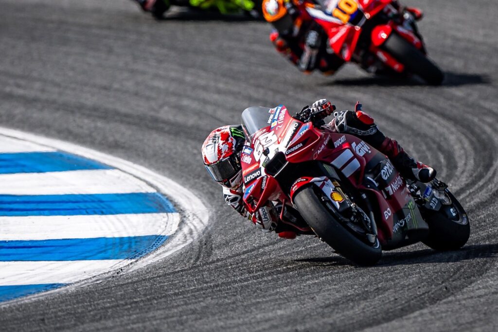 Tras una sólida pretemporada, la marca de Borgo Panigale puso fin en Buriram a una racha de 88 carreras consecutivas con al menos una Desmosedici entre los tres primeros. El mejor clasificado entre los pilotos de la marca fue Fabio Di Giannantonio, que terminó sexto, mientras que Pecco terminó noveno, a 18s340 de Marco Bezzecchi, quien dominó la carrera.