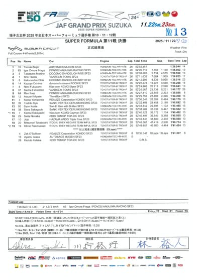 Al cabo de los 26 giros que se corrieron, Nojiri volvió a ganar después de más de un año en la Súper Fórmula, con Fraga y Makino como escoltas, en un marcado dominio de Honda. Tsuboi, Ohta, Kazuya Oshima, de buena carrera en sexto, Fukuzumi, Fenestraz, Sato y Miyake completaron la zona de puntos.